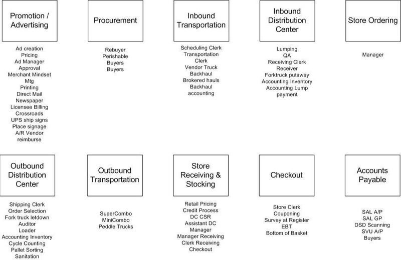 The figure above is a Value Stream Map of the Field to Table process. A Value Stream Map is a high level view of an organization’s “value added” flow. This Value Stream encompassed any part of the company that touched the product or added cost, as the product flowed from vendor to consumer. This includes functions that touch the product, such as distribution centers and stores, plus overhead functions involved in the promotion, ordering or procurement of each case of product.