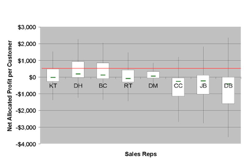 Of course some Sales Reps are much worse. From this data table and graph we can see that even very good Sales Reps have many unprofitable customers. In fact, the best Sales Reps “hide” their bad customers because they have some very good customers.