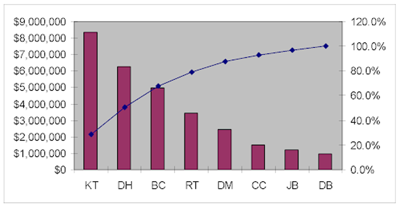 On the following pages are the two important graphs. First is a Pareto Chart of total sales by Sales Rep. These results were not surprising. KT is clearly the best Sales Rep as measured by Sales $. Everyone knew that. On the right side of the graph is “cumulative percentage”. KT generates 25% of Sales $.