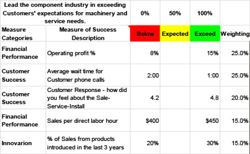 To implement The Business Balanced Scorecard you must start at the top. Scorecards are hierarchical, they flow down from the highest level of the organization. Each scorecard must support the scorecard above. You should use the measurement categories as guidelines to choose measures. After you decide on the measures that define great performance, you must “weight” the measures based on importance. (The total “weight” is 100%.) Weighting is an opportunity to create alignment amongst the team. These weights are decided and debated until consensus is achieved.