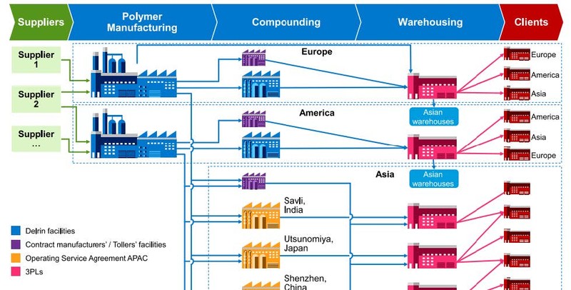 A division of a Fortune 50 manufacturer was preparing their supply chain network strategy for their divestiture from the parent company. The business needed to analyze a variety of supply chain footprint options to support the planned growth while exiting parent-company facilities at pre-determined time periods. The global supply chain consisted of raw material sourcing, polymer manufacturing, compounding, and warehousing.